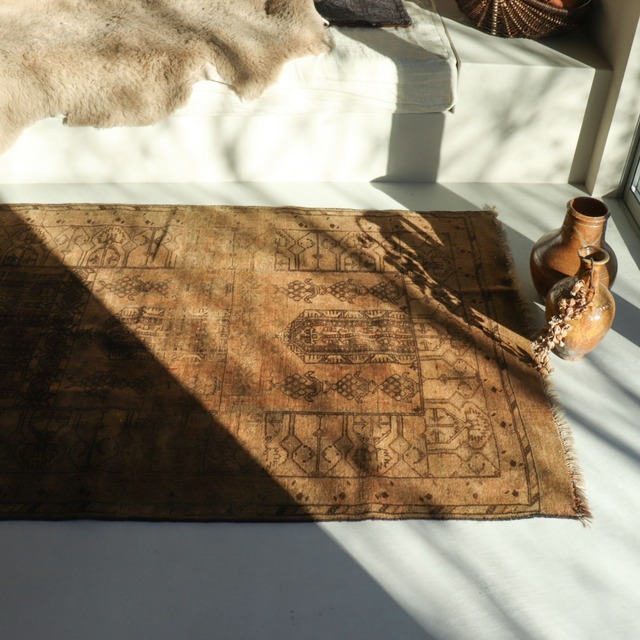 バルーチラグ 深い色合いが魅力的なこちらのラグ。 一見すると全体的に黒だけ使われているように見えるのですが、 目を凝らすと深いブラウンやレッドが使用されており、奥行きのある色使いがとても素敵です。 幾何学模様もカッコ良く、男前な一枚です。 ・サイズ: 107×184 cm(フリンジ含む) ・年代:1970年代(50years old) ・産地: Kawdani baluch ・ウール100% ※こちらインスタグラムに動画もアップしております。 ぜひ併せてみてみてください! https://www.instagram.com/p/Co1x2KYPg3_/ https://www.instagram.com/reel/Cowm3ZktwRB/ (1枚目のラグです) <インスタグラム割引適用あり> こちらインスタのDMよりご購入いただければ、割引価格が適用となります。 BASE価格より、最大6.5%offとなります。 気になる方はDMにてお問い合わせくださいませ♩
