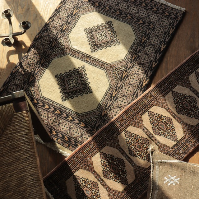 キャメル×マスタードカラーのラグ 幾何学模様と優しい色味が素敵な一枚。 写真ではあまり表現できなかったのですが、 光沢のある毛足も綺麗です。 どこかレトロでキッチュな雰囲気もあるので、 和っぽいインテリアなどにも合いそうですね。 ソファーとかにかけてみたりしても雰囲気変わって可愛いです☺️ ・サイズ: 77×121cm(フリンジ含む) ・年代:1990年代(30years old) ・産地: パキスタン ・ウール100% <インスタグラム割引適用あり> こちらインスタのDMよりご購入いただければ、割引価格が適用となります。 BASE価格より、最大6.5%offとなります。 気になる方はDMにてお問い合わせくださいませ♩ ・注意事項: ・自然光と均一な光の入る部屋で撮影しています。 ・商品写真はできる限り実物の色に近づけるよう加工しておりますが、お客様のお使いのモニター設定、お部屋の照明等により実際の商品と色味が異なる場合がございます。 ・当店で取り扱っているものはヴィンテージ品のため、経年変化による擦れや歪み、色の変化などが見られる商品もございます。 また羊毛製品につきましては、羊毛特有の匂いを感じるものもございます(使用されていくうちに軽減されます) それらをご理解・ご了承いただいた上でご購入をお願いいたします。 ・現地で洗浄済みのラグを販売しておりますが、稀に内部の繊維くずや埃などが取りきれていない商品もございます。(おおよそのラグは問題ございません)気になる方は到着後に掃除機がけまたは、クリーニングに出されることもご検討ください。