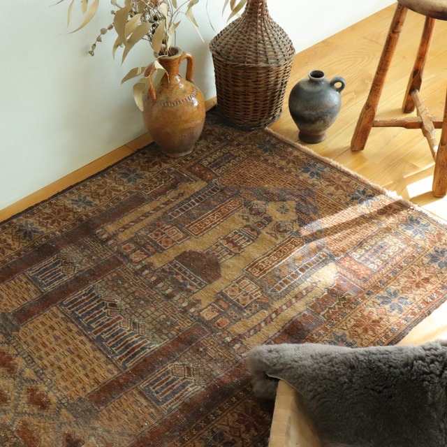 こちらはアドラスカン地域で作られた素敵な一枚 少しクラシカルなデザインが特徴的なこちら。 毛足に光沢があるので角度によって 霞みががって見えたり、柄がはっきり見えたり、枯れたような質感に見えたり… ちょっと不思議な見え方をします(インスタグラム内の動画で詳しく見えます) そんな質感がよりヴィンテージ感強く、味のある風合いとなっていて素敵です。 ・サイズ: 90×132 cm ・年代:1960年代(60years old) ・産地: アフガニスタン Adraskand ・ウール100% ※自然光と均一な光の入る部屋で撮影しています。 ※こちらインスタグラムに動画もアップしております。 ぜひ併せてみてみてください! https://www.instagram.com/p/C55l9L8PAsw/?img_index=1 <インスタグラム割引適用あり> こちらインスタのDMよりご購入いただければ、割引価格が適用となります。 BASE価格より、最大6.5%offとなります。 気になる方はDMにてお問い合わせくださいませ♩ ・注意事項: ・商品写真はできる限り実物の色に近づけるよう加工しておりますが、お客様のお使いのモニター設定、お部屋の照明等により実際の商品と色味が異なる場合がございます。 ・当店で取り扱っているものはヴィンテージ品のため、経年変化による擦れや歪み、色の変化などが見られる商品もございます。 また羊毛製品につきましては、羊毛特有の匂いを感じるものもございます(使用されていくうちに軽減されます) それらをご理解・ご了承いただいた上でご購入をお願いいたします。 ・現地で洗浄済みのラグを販売しておりますが、稀に内部の繊維くずや埃などが取りきれていない商品もございます。(おおよそのラグは問題ございません)気になる方は到着後に掃除機がけまたは、クリーニングに出されることもご検討ください。