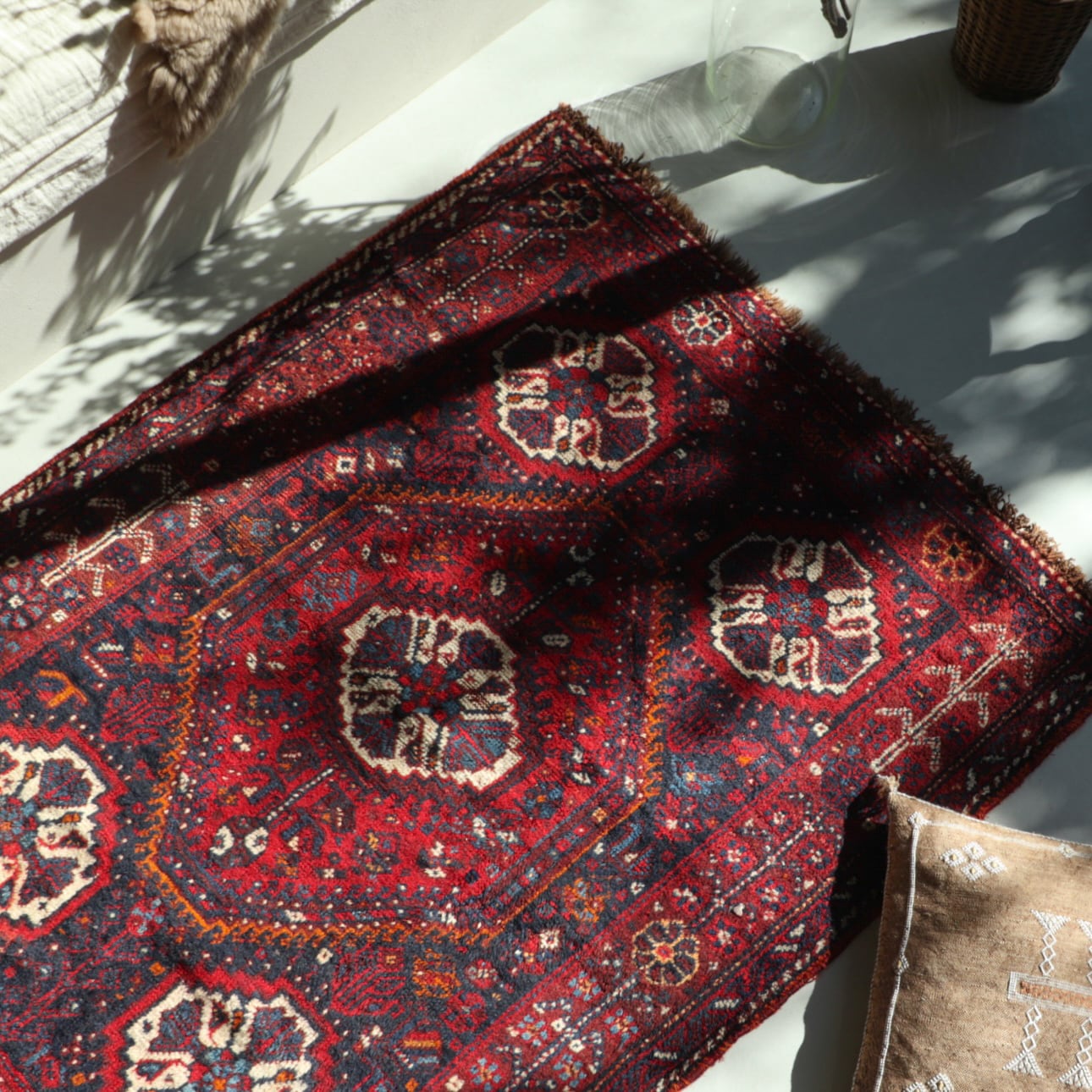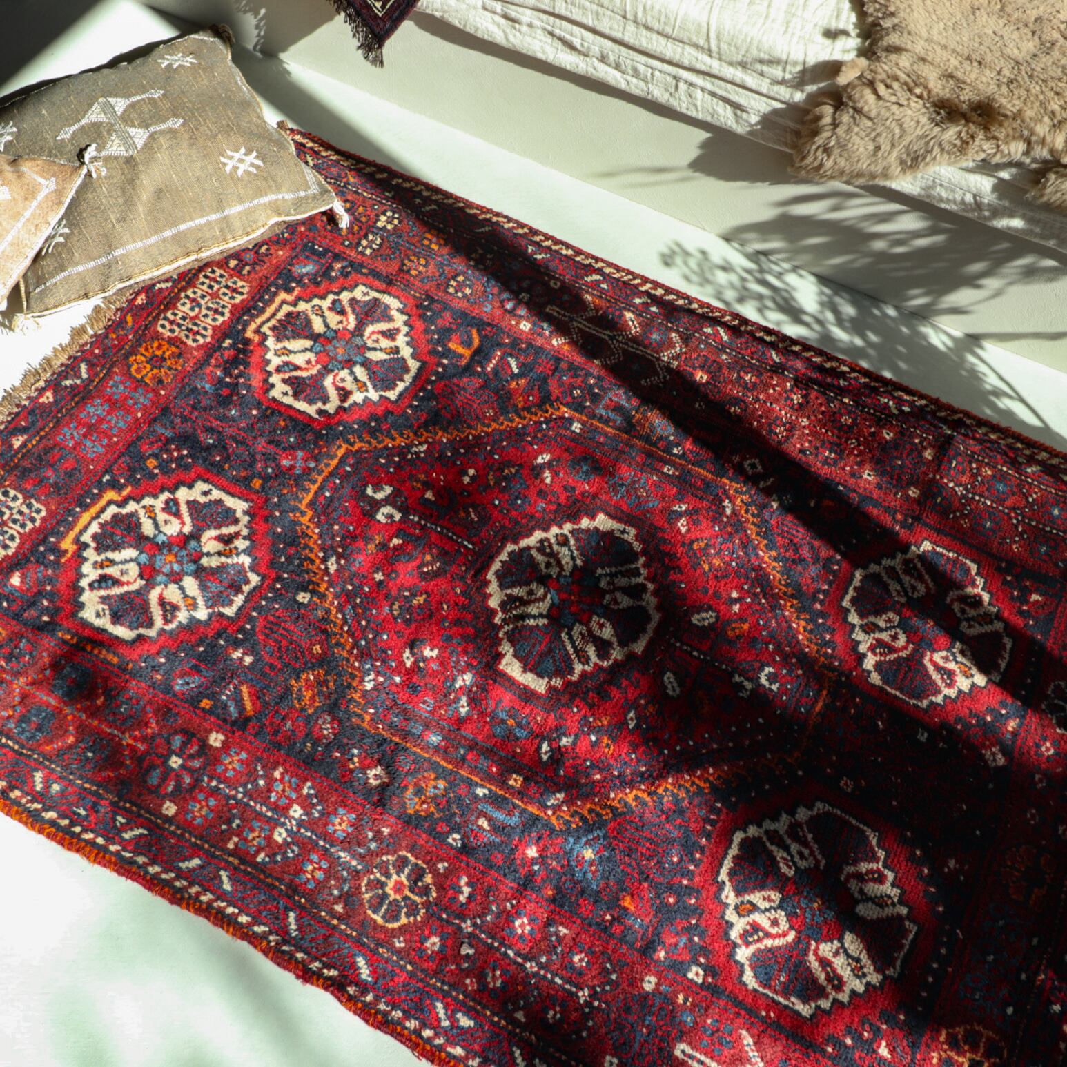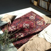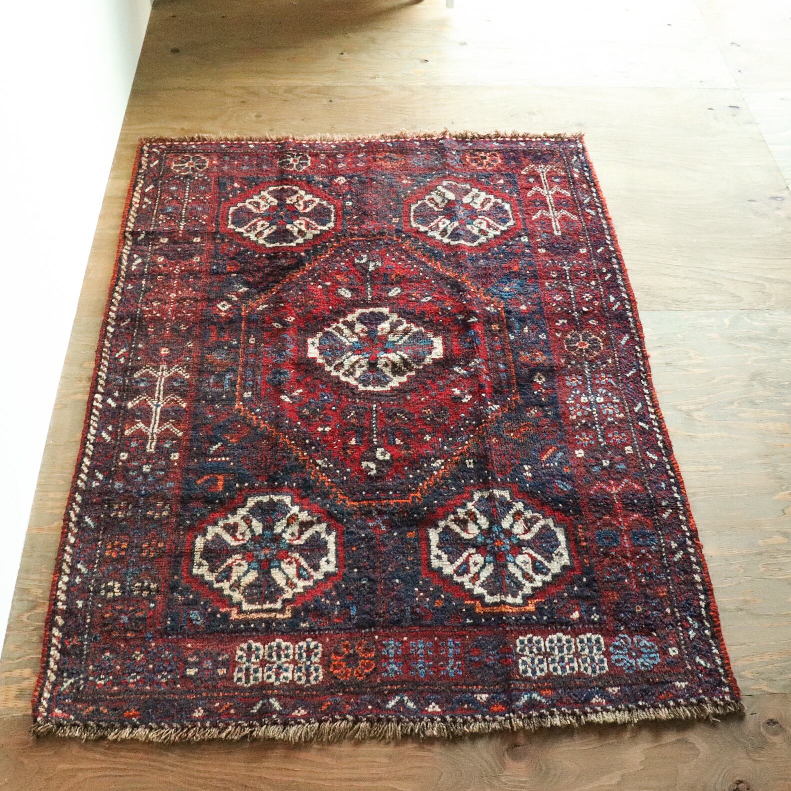 深く鮮やかな赤色ラグがとても目を引くシラーズラグ