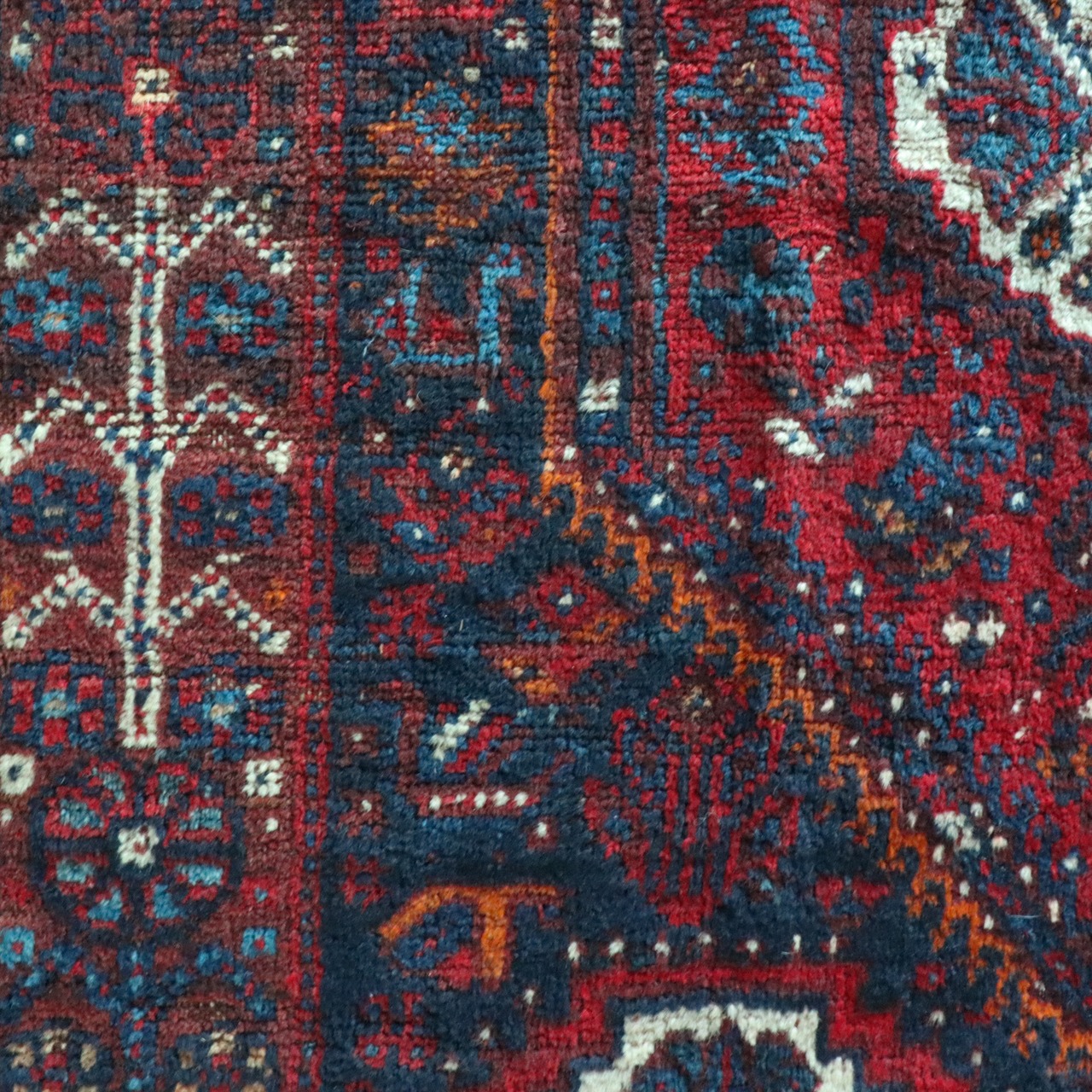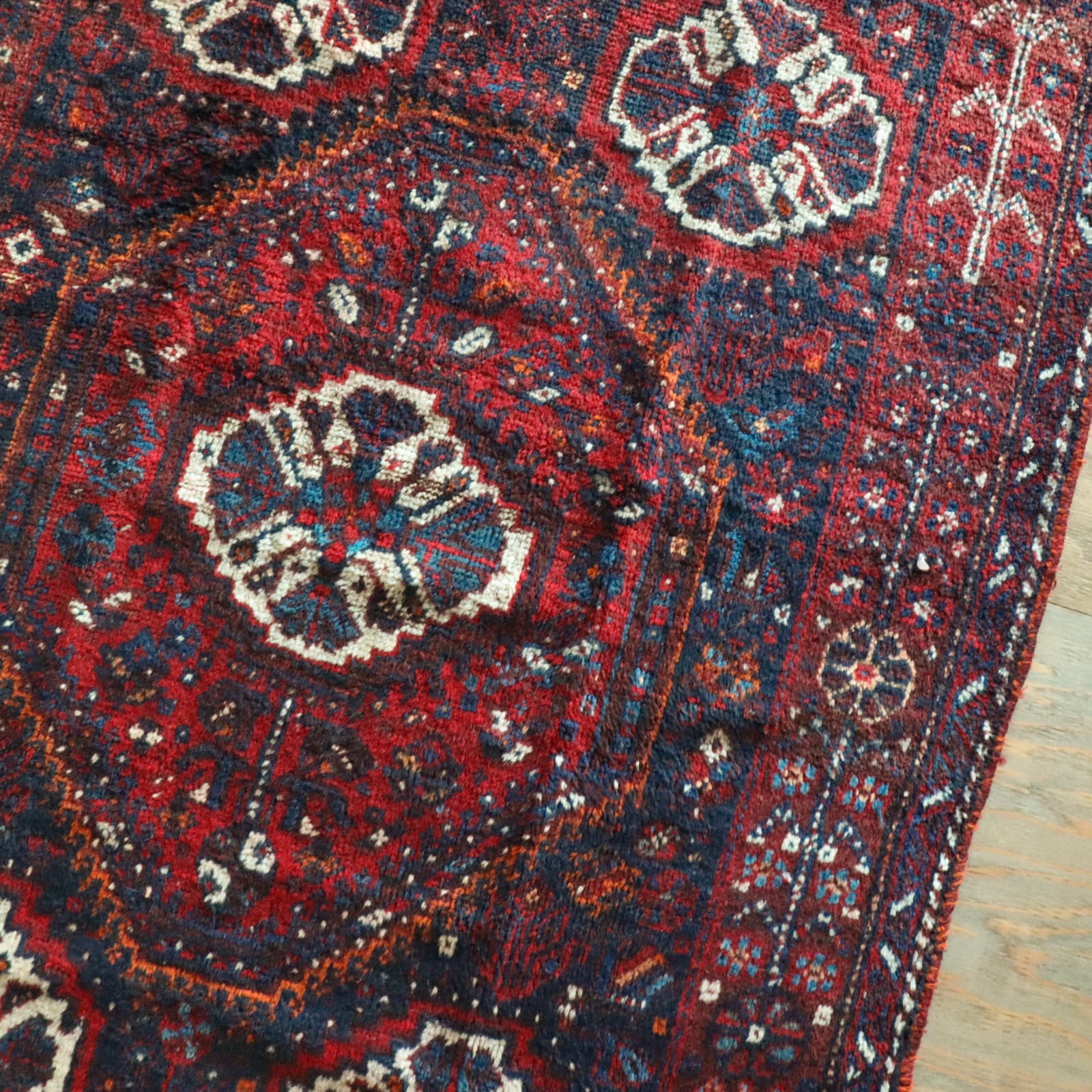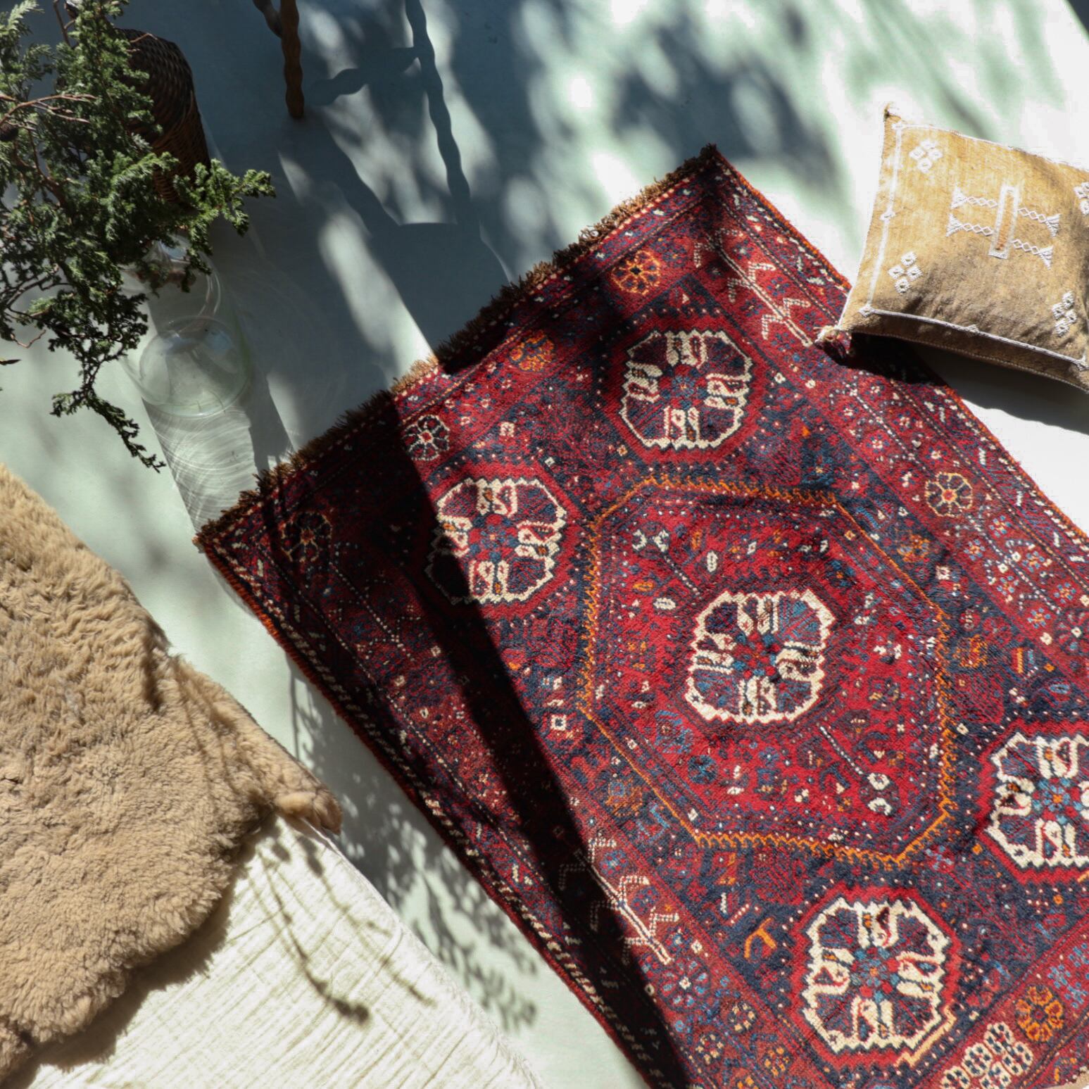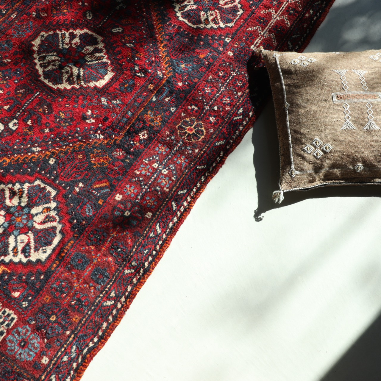 深く鮮やかな赤色ラグがとても目を引くシラーズラグ